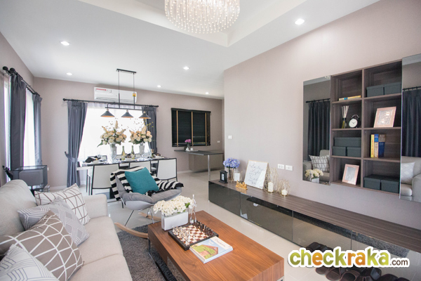 บ้านตัวอย่างพร้อมตกแต่งเฟอร์นิเจอร์ทั้งหลัง แบบ Mono สังเกตได้ว่าตัวบ้านออกแบบสไตล์ Modern Contemporary