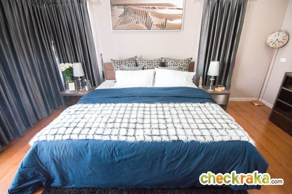 มุมนี้เมื่อจัดวางเตียงขนาดใหญ่แล้ว ยังมีพื้นที่เหลือพอวาง โต๊ะขนาดเล็กข้างเตียงได้อีกด้วย ส่วนตรงหัวเตียง