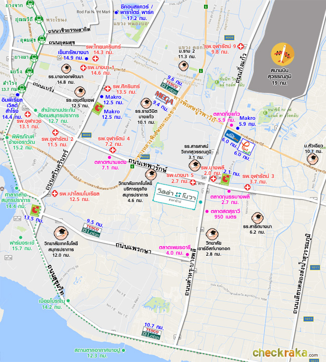 แผนที่แสดงระยะทางจากโครงการไปยังรถไฟฟ้าสายสีเขียว สถานีเคหะสมุทรปราการ