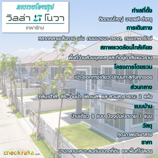 โครงการ วิลล่า โนวา เทพารักษ์ (Villa Nova Teparak) เป็นโครงการบ้านเดี่ยว ระดับพรีเมี่ยม ขนาด 2 ชั้น มีทางเข้า-ออกหลักเพียงทางเดียว ติดหน้าถนนบางพลี-ตำหรุ สร้างอยู่บนแปลงที่ดินขนาด 58 ไร่ 3 งาน 73.00 ตร.ว. มีบ้านทั้งหมด 266 หลัง ตรงเข้าโครงการมาจะเห็นคลับเฮ้าส์ตั้งอยู่ด้านหน้าสุดฝั่งขวามือ พร้อมสระว่ายน้ำระบบคลอรีน และฟิตเนส มีพื้นที่สีเขียวเป็นสวนสาธารณะส่วนกลางให้ถึง 2 จุด อยู่ช่วงกลางของโครงการและช่วงท้ายโครงการ รั้วรอบโครงการมีความสูงอยู่ที่ 3 เมตร มีถนนหลักช่วงแรกกว้าง 16-15-12 เมตร ตามลำดับความลึก และถนนภายซอยกว้าง 8 เมตร และ 8.5 เมตร