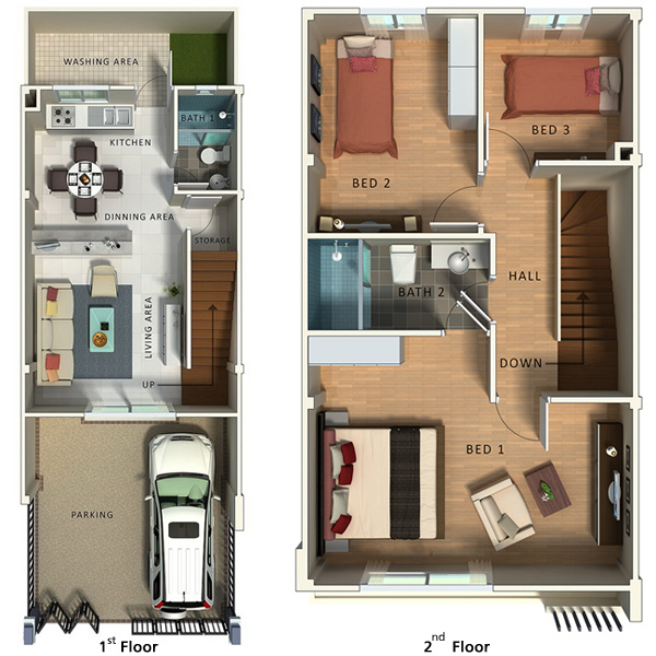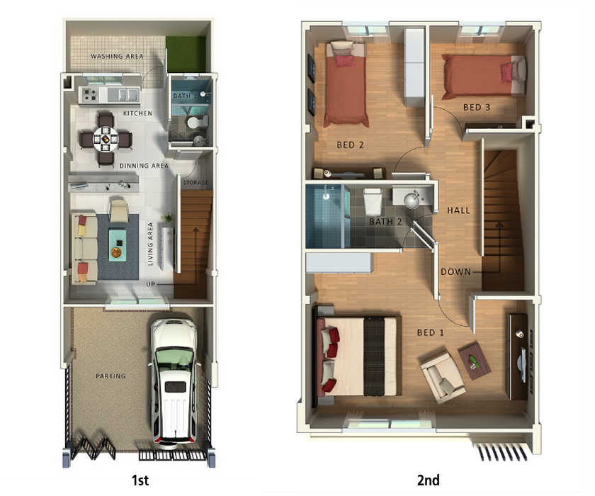 1. ทาวน์โฮม 2 ชั้น - หน้ากว้าง 5 เมตร ที่ดินเริ่มต้น 19.3 ตารางวา พื้นที่ใช้สอย 130 ตารางเมตร ขนาด 3 ห้องนอน, 2 ห้องน้ำ, ที่จอดรถ 2 คัน