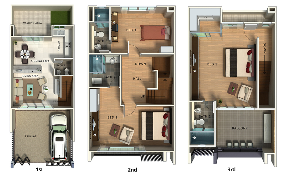 2. ทาวน์โฮม 3 ชั้น - หน้ากว้าง 5 เมตร ที่ดินเริ่มต้น 19.3 ตารางวา พื้นที่ใช้สอย 170 ตารางเมตร ขนาด 3 ห้องนอน, 4 ห้องน้ำ, ที่จอดรถ 2 คัน