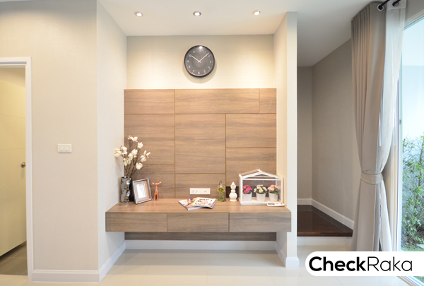 ฝั่งตรงข้ามโซฟารับแขกคือพื้นที่ที่ใช้จัดวางทีวี สามารถตกแต่งพื้นที่ส่วนนี้เป็นตู้เก็บของ หรือชั้นวางของก็ได้ค่ะ