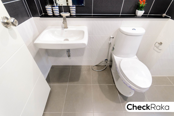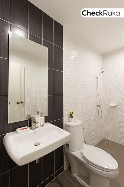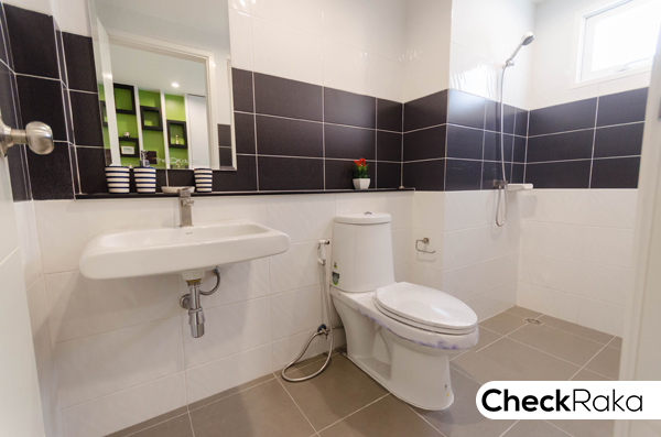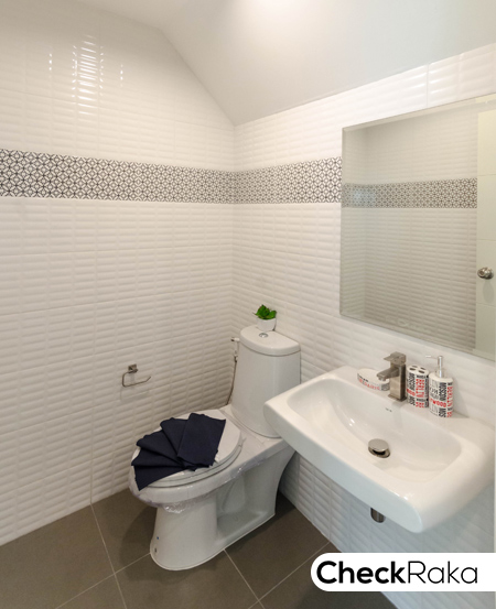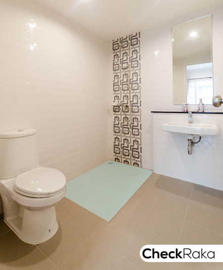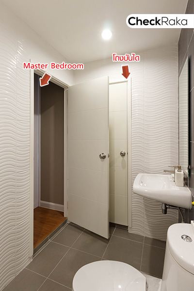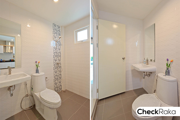 ภายในห้องน้ำให้สุขภัณฑ์มาครบ ทั้งโถสุขภัณฑ์ อ่างล้างมือ กระจก และฝักบัว นอกจากนี้พื้นส่วนเปียกยังลดระดับลง