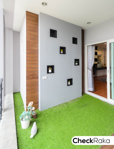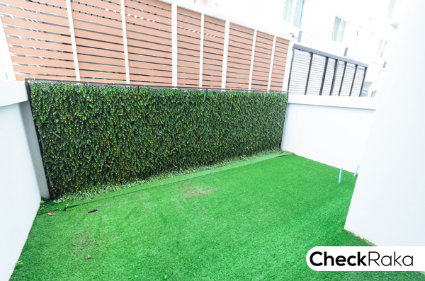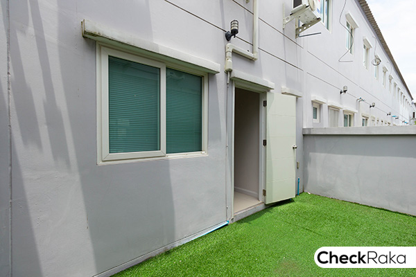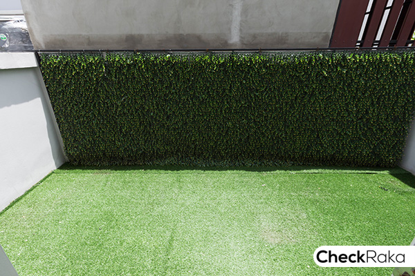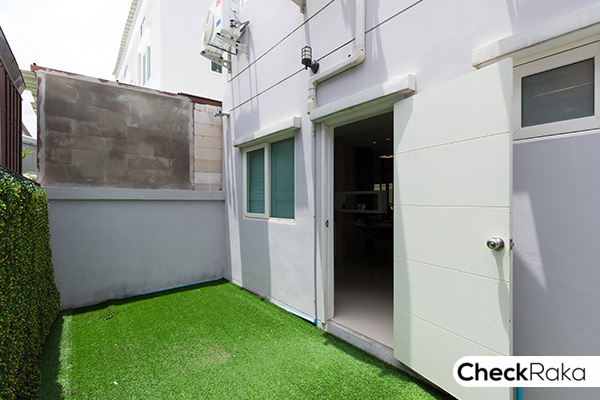 สำหรับลานซักล้างหลังบ้าน บ้านตัวอย่างปูหญ้าเทียมไว้เพื่อความสวยงาม