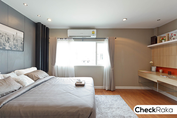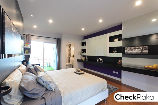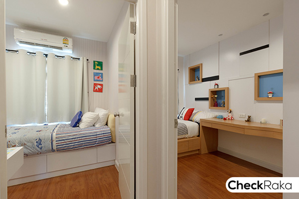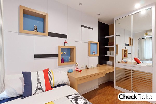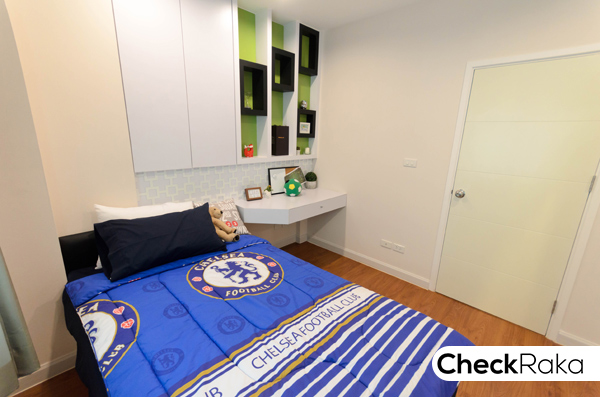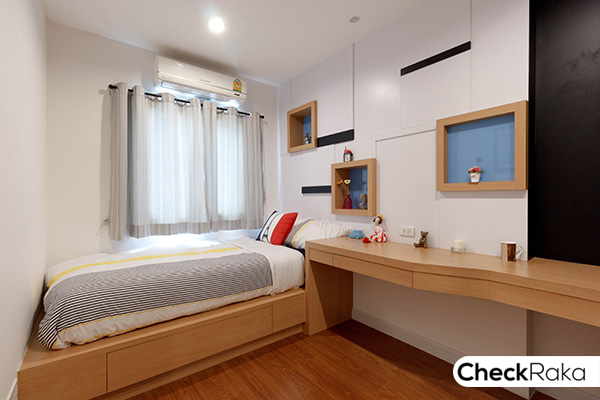 เหมาะสำหรับเป็นห้องนอนของคุณลูก มีพื้นที่ข้างเตียงทำเป็นโต๊ะเครื่องแป้งหรือโต๊ะอ่านหนังสือ