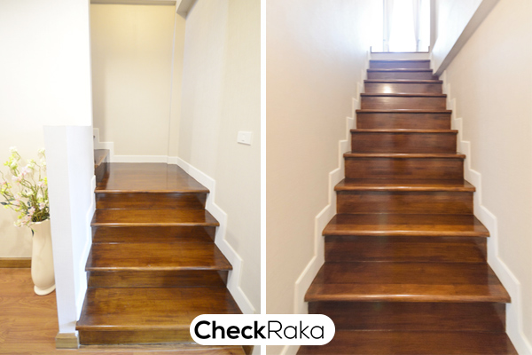 มีชานพักให้ 2 จุด แบบสี่เหลี่ม และแบบสามเหลี่ยม พื้นบันไดไม้อบทาเคลือบเงา