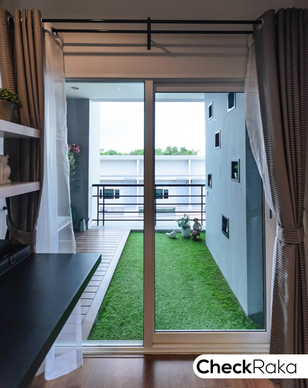 ระเบียงส่วนตัว เปิด-ปิดด้วยประตูบานเลื่อน ตัวประตูขนาดใหญ่ทำให้แสงธรรมชาติเข้ามาในห้องได้ดี