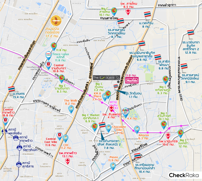 ระยะห่างจากโครงการถึงสถานีรถไฟฟ้าสายสีชมพู สถานีคู้บอน ประมาณ 3.4 กม.