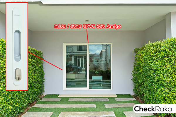 ประตูทางเข้าหลักเป็นประตูบานเลื่อนคู่ กระจกเขียวตัดแสง กรอบประตู UPVC สีขาวของ Amigo ไฟด้านหน้า