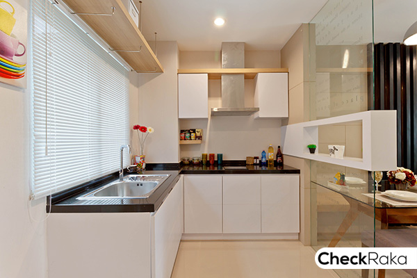 ติดกับห้องน้ำคือส่วนของห้องครัว ครัวที่นี่เป็นครัวเปิดนะคะ มีพื้นที่ใหญ่พอเหมาะ สามารถตกแต่งเป็นเคาน์เตอร์ตัว L