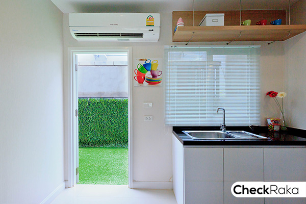 มีหน้าต่างบานเลื่อนเดี่ยวสำหรับเปิดระบายอากาศให้ 1 บาน ถ้าหากอยากทำกับข้าวหนักๆ แนะนำให้ต่อเติมครัวด้านหลังบ้านเพิ่มเติมได้เลย เพราะบ้านที่นี่ลงเสาเข็มให้ลึกเท่าตัวบ้านเพื่อรองรับการต่อเติม หรือจะติดประตูส่วนนี้ให้เรียบร้อย