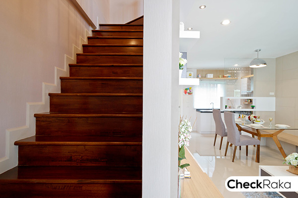 ดูภาพจากมุมนี้จะเห็นฟังก์ชั่นบ้านชั้น 1 ได้ชัดเจนขึ้น เริ่มจากบันไดทางขึ้นชั้น 2 ถัดมาเป็นพื้นที่วางทีวี