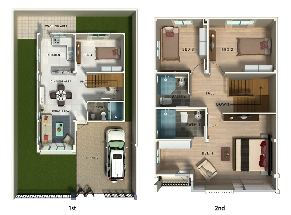 3. บ้านแฝด 2 ชั้น - ที่ดินเริ่มต้น 38.6 ตารางวา พื้นที่ใช้สอย 165 ตารางเมตร ขนาด 4 ห้องนอน, 3 ห้องน้ำ, ที่จอดรถ 2 คัน