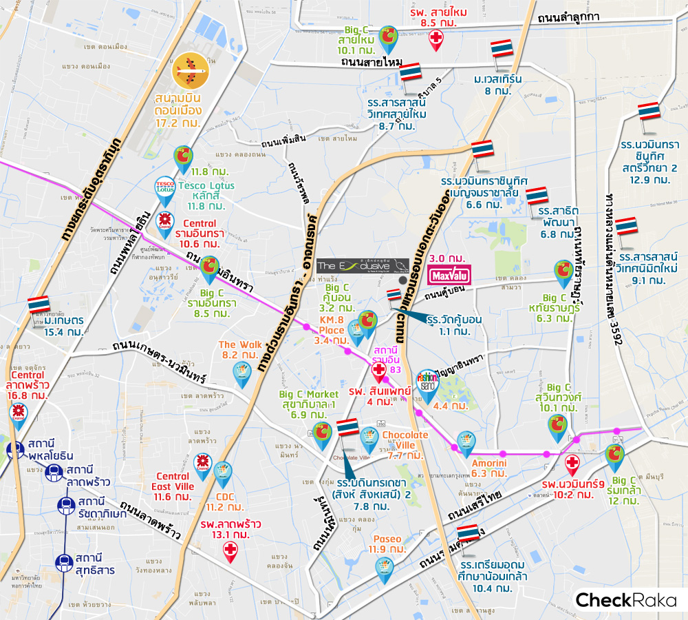 ระยะห่างจากโครงการถึงสถานีรถไฟฟ้าสายสีชมพู สถานีคู้บอน ประมาณ 3.4 กม.