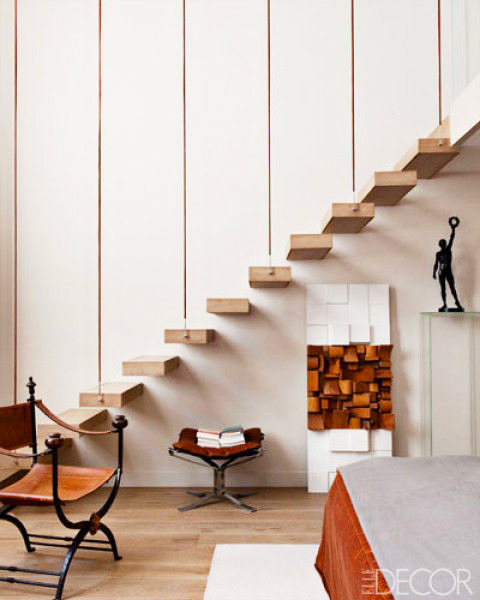 บันไดส่วนใหญ่จะมีราวบันไดเป็น "แนวนอน" มาแทนที่ราวบันไดแบบเดิมด้วยราวบันได "แนวตั้ง" ที่ทำมาจากเชือกเคเบิลของเรือยอร์ชหุ้มด้วยหนังแท้กันดีกว่าค่ะ จะเหมือนเชือกยึดตรึงแขวนบันไดไว้กับเพดาน ให้อารมณ์คล้ายสะพานแขวนเลย