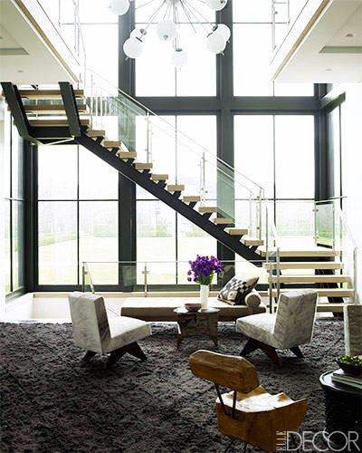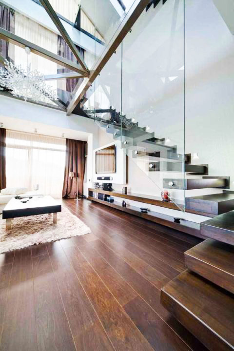 ใช้กระจกกั้นจากราวบันไดจนถึงเพดาน นอกจากจะเป็นการเพิ่มลูกเล่นเท่ๆ ให้บันไดแล้ว ยังง่ายต่อการทำความสะอาดด้วย