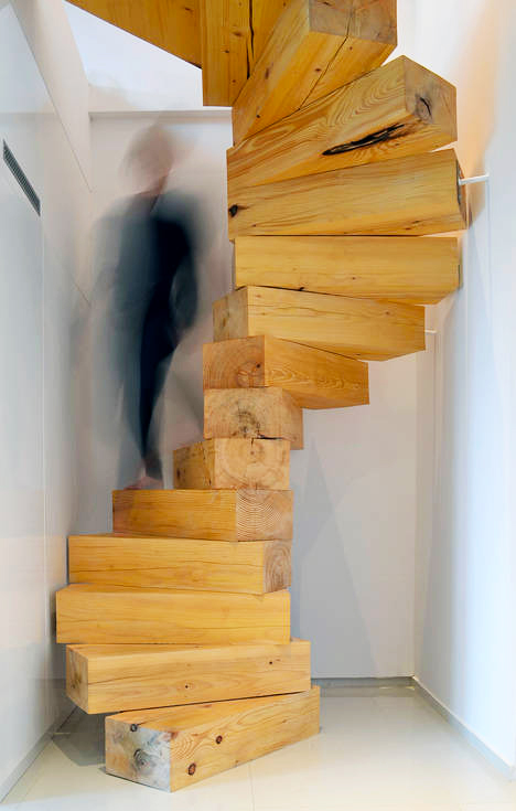 บันไดที่ทำจากไม้วอลนัตนี้มีลูกเล่นเจ๋งทีเดียว ด้วยการต่อขั้นบันไดสลับซ้ายสลับขวา เวลาขึ้นลงบันได้คงต้องจับราวบันได้ให้แน่น ระวังก้าวพลาดกันสักหน่อยนะคะ