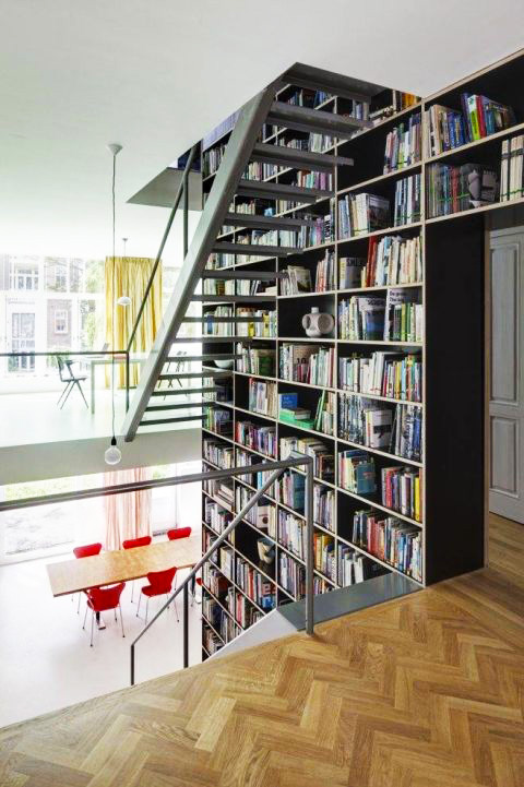 ในกรณีบ้านมี 3 ชั้น อาจทำบันไดเชื่อมระหว่างชั้นเก๋ๆ ด้วยการเอาชั้นวางหนังสือยาวตั้งแต่ชั้น 1 ถึงชั้น 3 ตั้งเป็นราวบันไดเสียเลย