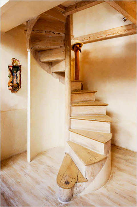 เหมาะกับบ้านที่มีพื้นที่ค่อนข้างจำกัด บันไดทำจากบล็อกไม้ หนา แข็งแรง เรียงตัวแน่นหนาตามแบบฉบับของบันไดวน ใช้พื้นที่น้อยแต่แข็งแรงอย่าบอกใคร