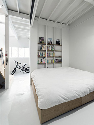 ถัดมาอีกนิดก็ถึง "ห้องนอน" แล้วค่ะ อยู่ไม่ไกลจากห้องโถงเท่าไร อยู่ติดกับบันได้ขึ้นชั้นบนเลยค่ะ มีกำแพงสีดำขรึมๆ กั้นบริเวณหัวนอนเพื่อเพิ่มความเป็นส่วนตัว ขนาดห้องไม่ใหญ่มากแต่เพียงพอสำหรับเตียง, ตู้เสื้อผ้าและชั้นวางของ