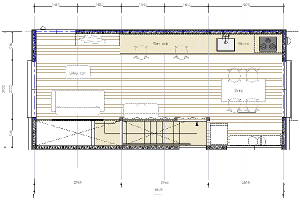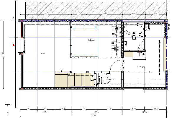 พื้นที่ชั้นล่าง จะแบ่งออกเป็น 3 ส่วน คือ ห้องโถง, ห้องนอน และห้องน้ำ โดยจะถูกแบ่งสันปันส่วน และเปิด-ปิดด้วย "ผ้าม่าน" ทั้งหมด