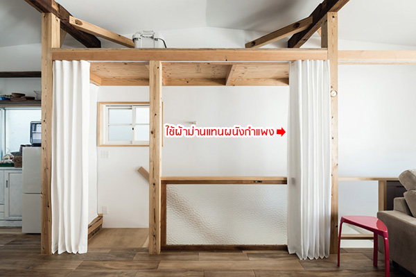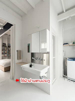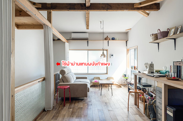 สิ่งที่ Matumura เลือกจะเปลี่ยนทาวน์เฮ้าส์เก่า 2 ชั้น พื้นที่ 64 ตารางเมตรให้กลายเป็นทาวน์เฮ้าส์สุดชิค คือการใช้ "ผ้าม่าน" มาเป็นฉากกั้นห้องต่างๆ ภายในบ้านแทนที่ผนังปูนซีเมนต์ธรรมดาๆ
