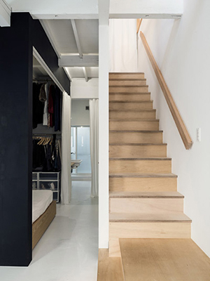 ถัดมาอีกนิดก็ถึง "ห้องนอน" แล้วค่ะ อยู่ไม่ไกลจากห้องโถงเท่าไร อยู่ติดกับบันได้ขึ้นชั้นบนเลยค่ะ มีกำแพงสีดำขรึมๆ กั้นบริเวณหัวนอนเพื่อเพิ่มความเป็นส่วนตัว ขนาดห้องไม่ใหญ่มากแต่เพียงพอสำหรับเตียง, ตู้เสื้อผ้าและชั้นวางของ