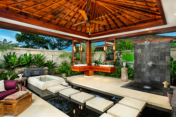 การจะมีห้องน้ำกลางแจ้งแบบที่แนบชิดธรรมชาติแต่ผสานไว้ซึ่งความเรียบหรูอยู่ในที บางครั้งอาจจะไม่ยากอย่างที่คิด เพียงหาสวนหรือพื้นที่ที่มีความเป็นส่วนตัว สร้างเป็นพื้นที่อาบน้ำกลางแจ้ง โดยเลือกวัสดุจากธรรมชาติอย่าง หิน หรือไม้ นำมาเป็นส่วนประกอบในการตกแต่ง เพิ่มความสดชื่นและร่มรื่นด้วยพรรณไม้นานาชนิด ติดตั้งอ่างอาบน้ำ อ่างจากุซซี่ และฝักบัวรูปทรงเรียบหรู โก้เก๋ เข้าไป เพียงแค่นี้ก็ได้ห้องน้ำที่สุดแสนจะผ่อนคลายเป็นของตัวเองแล้ว
