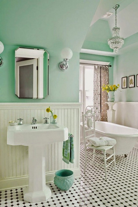 ทาสีห้องน้ำด้วยสีอ่อนๆ พาสเทลๆ จะได้คงความเป็นวินเทจ ห้องน้ำสไตล์วินเทจมักจะเน้นเรื่อง "อ่างอาบน้ำ" ค่ะ และมีอุปกรณ์อาบน้ำกระจุกกระจิกตั้งไว้ให้หยิบใช้ได้สะดวก