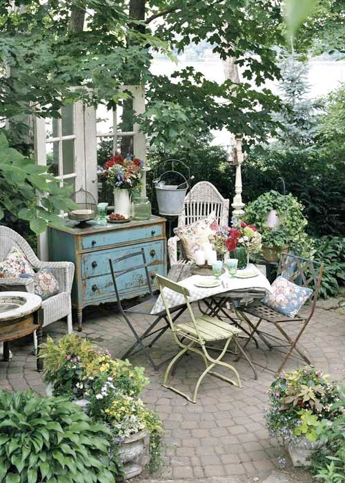 สวนเล็กๆ จะอยู่หน้าบ้านหรือหลังบ้านก็ได้ค่ะ ลองหาชุดรับแขกเล็กๆ อาจเป็นโซฟานุ่มๆ หรือชุดโต๊ะเหล็กให้อารมณ์เก่าๆอย่าลืมเรื่องต้นไม้นะคะ วางกระถางดอกไม้เล็กบ้างใหญ่บ้าง ทำซุ้มต้นไม้สักหน่อยพอให้เป็นร่มเงากับชุดรับแขก นั่งจิบชาชิลล์ๆ วินเทจเก๋ๆ อย่าบอกใครเลยค่ะ