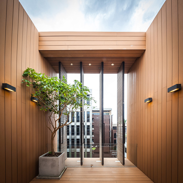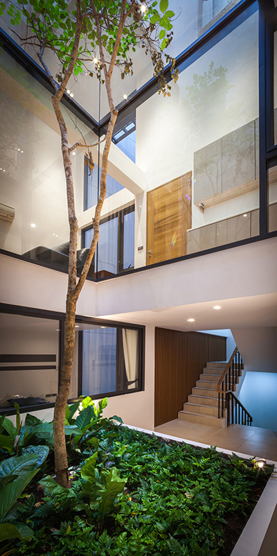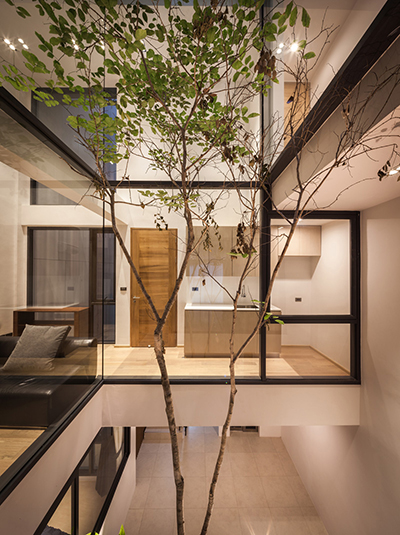 ความเท่ของบ้านหลังนี้ คือมี "ต้นไม้" อยู่กลางบ้านที่มีความสูงในระดับที่มองเห็นผ่านกระจกใสตรงกลางได้ทุกชั้น