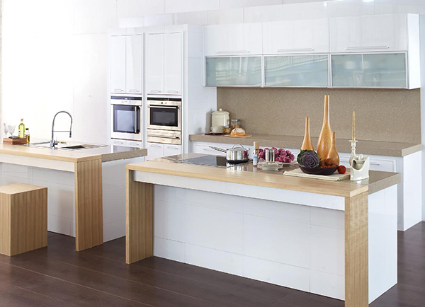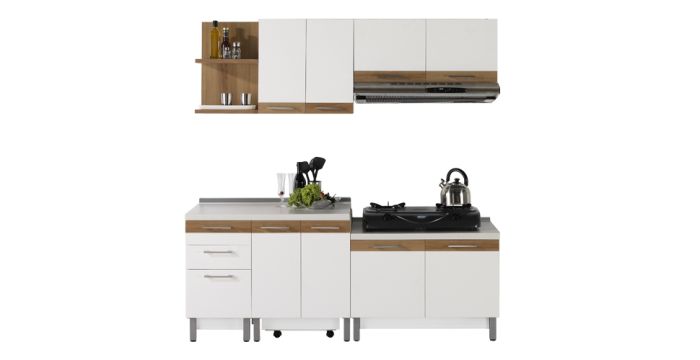 2) Lineo Kitchen Series (City Modern Style) เอาใจคนเมืองด้วยดีไซน์สไตล์โมเดิร์น ออกแบบเรียบง่าย เข้าได้กับทุกการตกแต่ง วัสดุเป็นโครงสร้างไม้ E1 มาตรฐานยุโรป พร้อมช่องเสียบปลั๊กไฟสำหรับหม้อหุงข้าวและไมโครเวฟ