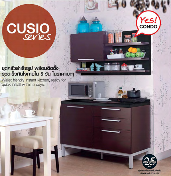 3) Cusio Kitchen Serie (City Modern Style) โดดเด่นด้วยการจัดวางแบบ Module System ท็อปเคาน์เตอร์ปิดผิวด้วย HPL (High Pressure Laminate) ป้องกันเชื้อราและรอยขีดข่วนได้ดี