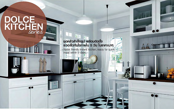 1) Dolce Kitchen Series (Country Cottage Style) ชุดครัวรูปแบบใหม่ ดีไซน์สไตล์คันทรี่ คอทเทจ มาพร้อมขนาดพอเหมาะ และฟังก์ชันการใช้งานที่จำเป็น ไม่ว่าจะเป็นปลั๊กไฟ ที่วางหม้อหุงข้าวแบบเลื่อนได้ซึ่งจะทำให้ประหยัดพื้นที่ พร้อมวัสดุคุณภาพสูงมาตรฐานเยอรมัน อายุการใช้งานกว่า 25 ปี
