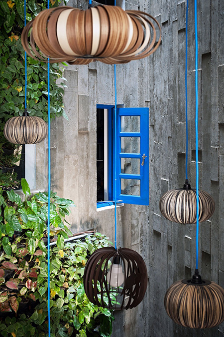 มุมเฉียงตรงระเบียงนั้น ด้านบนเปิดเป็นช่องไว้เพื่อรับแสงจากธรรมชาติค่ะ เจาะหน้าต่างสำหรับสูดอากาศเบาๆ เวลาฝนตกยื่นมือออกมาสัมผัสน้ำฝนได้เลย ตามกำแพงของส่วนนี้ปลูกพันธุ์ไม้เลื้อยเพิ่มความเขียว