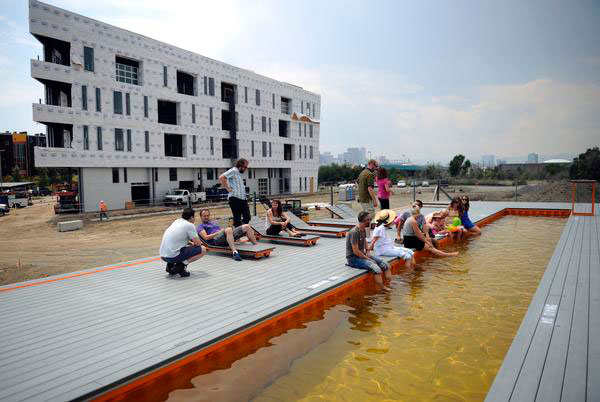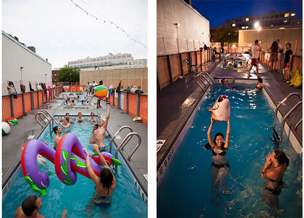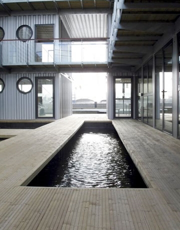สระวายน้ำที่เชื่อมต่อตู้คอนเทนเนอร์เข้าไว้ด้วยกัน ด้านบนกลายเป็นลานกว้างไว้ให้นั่งเล่น