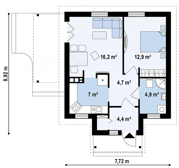 แบบแปลนภายในบ้าน มี 1 ห้องนอน 1 ห้องน้ำ 1 ห้องครัวและมุมรับแขก