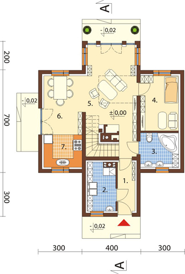 แปลนบ้านชั้นล่าง มีห้องนอนใหญ่อยู่ 1 ห้อง ซึ่งห้องนี้สามารถใช้เป็นห้องนอนสำหรับผู้สูงอายุได้เลย