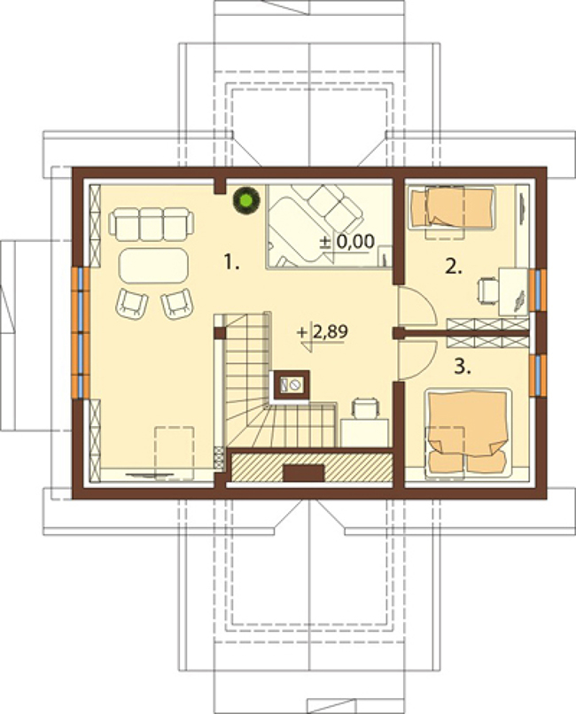 แปลนชั้นบน มีห้องนอน 2 ห้อง และมุมรับแขกหรือมุมสันทนาการในครอบครัว