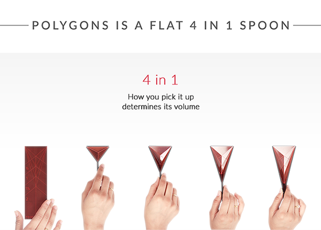 "ช้อน" เป็นสิ่งของที่เราใช้มานานจนเคยชินกับหน้าตา แต่วันนี้มีนวัตกรรมใหม่เพื่อชีวิตที่ง่ายกว่าอย่าง "Polygons" ช้อนตวง 4 in 1 รูปทรงใหม่ที่สามารถเลือกปรับขนาดได้ 4 ขนาดตามต้องการด้วยอาศัยหลักการเลือกจับตามรอยพับก็จะได้ช้อนตวงมาตรฐาน ทำให้เรื่องตักๆ ตวงๆ อาหารของคุณกลายเป็นเรื่องสะดวกและง่ายขึ้น มีช้อนตวงแบบนี้ไว้ที่ครัวในบ้านสักชุดน่าจะทำให้คุณดูฮิปล้ำนำสมัย และที่สำคัญเจ้าช้อนนี่ยังมีคุณสมบัติหลายอย่างที่เข้าข่ายช่วยรักษ์โลกด้วยนะ