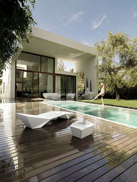แบ่งพื้นที่นั่งพักผ่อนด้วยพื้นไม้ระแนงข้างสระว่ายน้ำและพื้นที่สีเขียวของสนามหญ้า