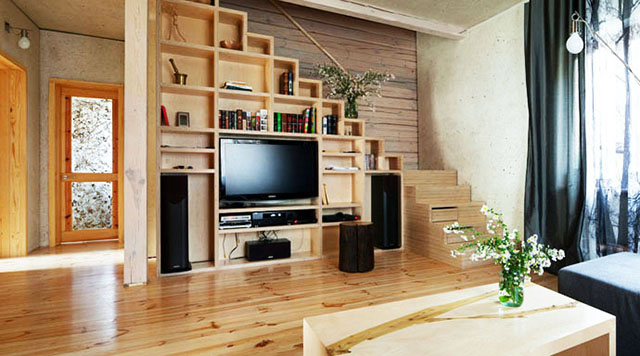 บิวท์อินให้เป็นชั้นวางของและทีวี นอกจากจะประหยัดพื้นที่แล้วยังดูโมเดิร์นสุดๆ