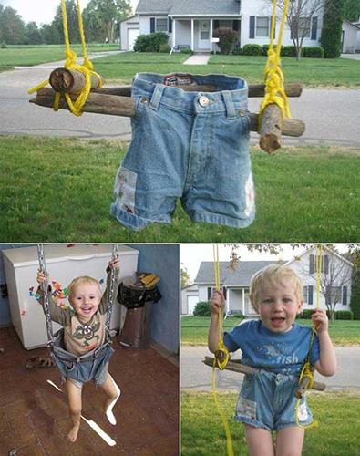 อันนี้สร้างสรรค์นำของเหลือใช้อย่างกางเกงยีนส์ที่ขึ้นชื่อว่าผ้าทนสุดมาแขวนเป็นชิงช้า แบบนี้ครีเอทแต่รับน้ำหนักได้ไม่มาก