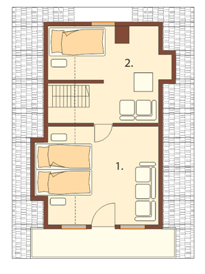 ตัวบ้านเป็นบ้าน 2 ชั้น 2 ห้องนอน 1 ห้องน้ำ สำหรับชั้น 2 จะเป็นอารมณ์แบบห้องใต้หลังคาค่ะ หลังบ้านเป็นทรงสูง แคบหน้าบ้านมีชานกว้างๆ หลังบ้านเป็นห้องครัวมีบันไดเชื่อมไปด้านนอกได้อีกทาง