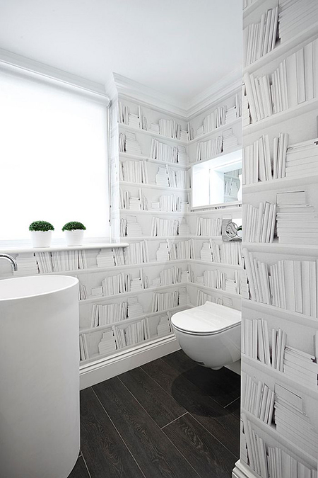 เชื่อแล้ว...ห้องน้ำของหนอนหนังสือจริงๆ ติดวอลล์เปเปอร์ลายหนังสือซะเลย คลาสสิกสุด