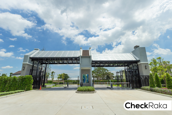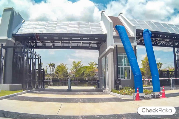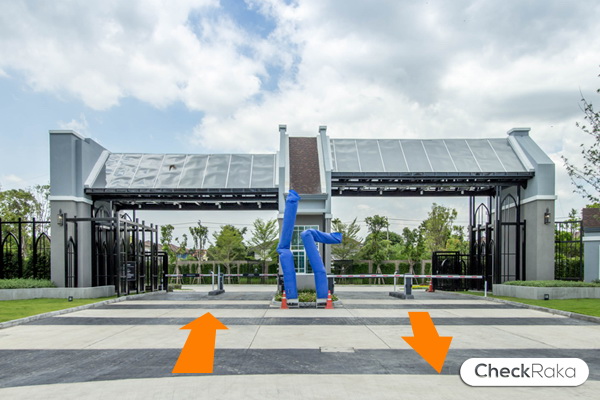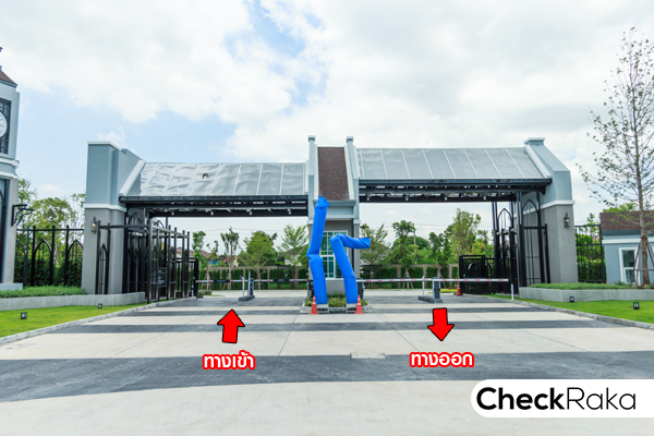 ซุ้มประตูโครงการมีขนาดใหญ่สไตล์อังกฤษ มีหลังคาบังแดดและกันฝนได้ เวลาสแกนบัตรไม่เปียกแน่นอน