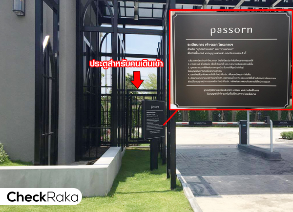 ทางเดินฝั่งซ้ายมือมีประตูบานเล็กสำหรับคนเดินเข้า-ออกให้ และมีป้ายแจ้งระเบียบการเข้า-ออกโครงการ