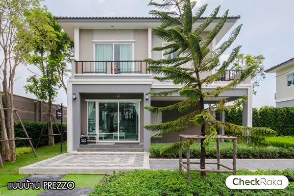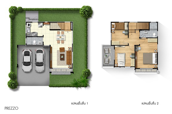 1. แบบบ้าน Prezzo - บ้านเดี่ยว 2 ชั้น พื่นที่ใช้สอย 120 ตารางเมตร ที่ดินเริ่มต้น 50 ตร.ว. ขนาด 3 ห้องนอน 2 ห้องน้ำ ที่จอดรถในร่ม 2 คัน