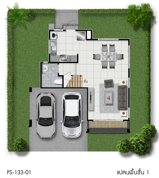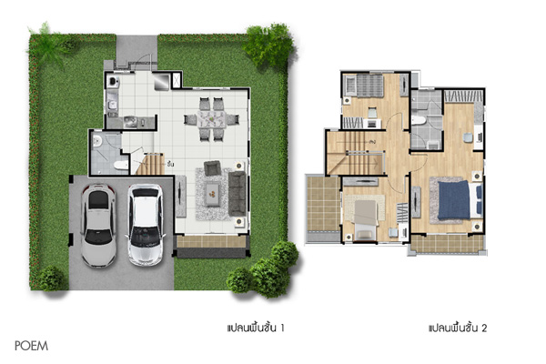 2. แบบบ้าน Poem - บ้านเดี่ยว 2 ชั้น พื้นที่ใช้สอย 133 ตารางเมตร ที่ดินเริ่มต้น 50 ตารางวา ขนาด 3 ห้องนอน 2 ห้องน้ำ ที่จอดรถในร่ม 2 คัน